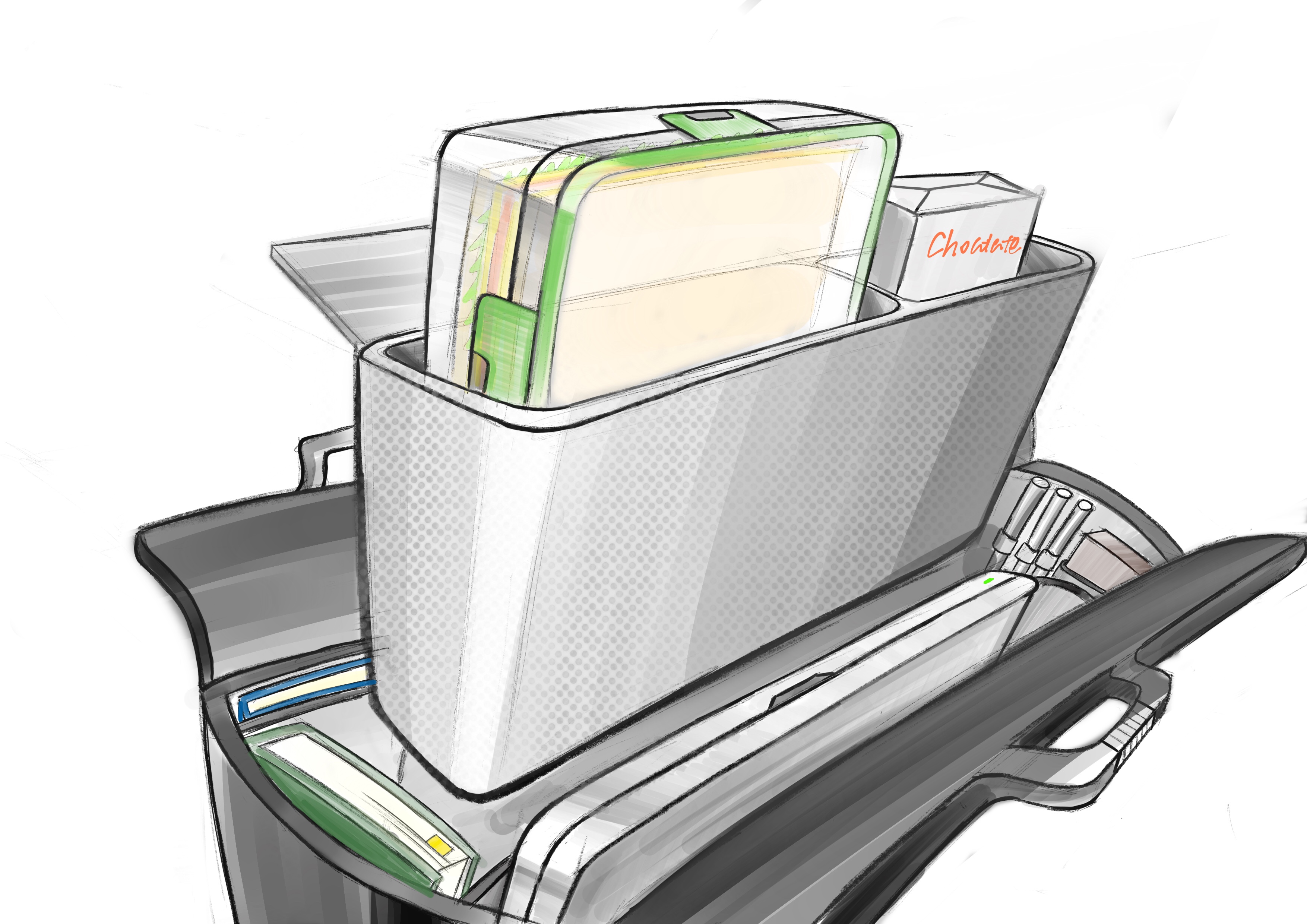 According to the survey, people want to have less bulky lunchboxes. Also, people do not like the risk of spilling. Therefore a plastic case was designed, where a lunchbox, snack box and bottle fits in perfectly. It allows for the lunchboxes to be easily accessible, and protects the bags in case the lunchboxes do leak. The large lunch box has the same height as the bottle and the snack box, but 2 times the width. This will result in the choice of the customer to have 2 snack boxes instead of 1 lunchbox.