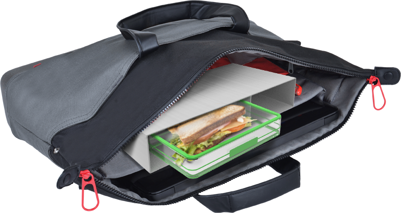 SlimLine - a line of products consisting of two lunch boxes, one for snacks and one for lunch, that are designed to fit inside laptop bags without spilling. A thermos/drinking bottle will be included as well. All the products have the same height and depth, only varying in width. They match in their professional design. SlimFit - The SlimFit is the sleeve complimentary to the SlimLine products, designed to contain them in the bag. It makes it easier to take everything out, adds a level of security against spilling, and keeps the lunchboxes in place and accessible. It allows for flexibility in what to take, as the boxes are proportional in width, meaning that 2 snack boxes equal the width of 1 lunch box.